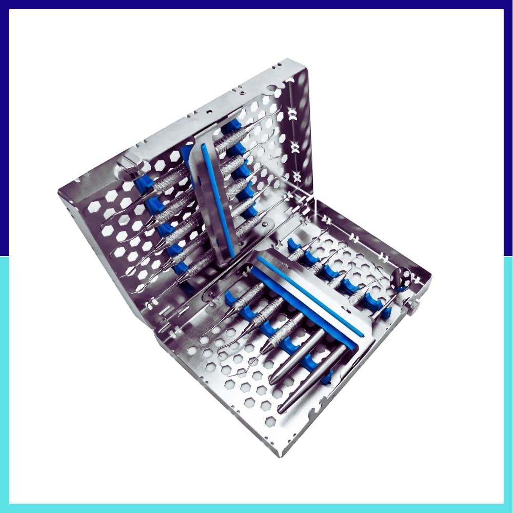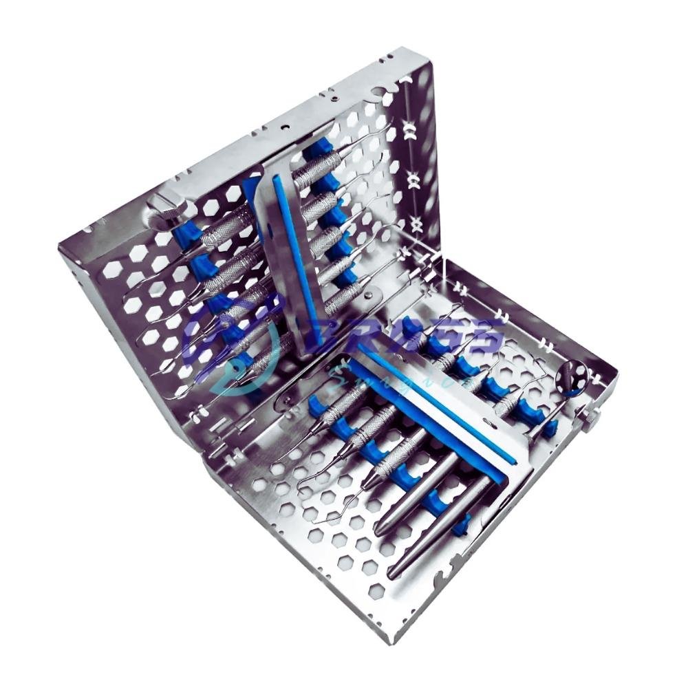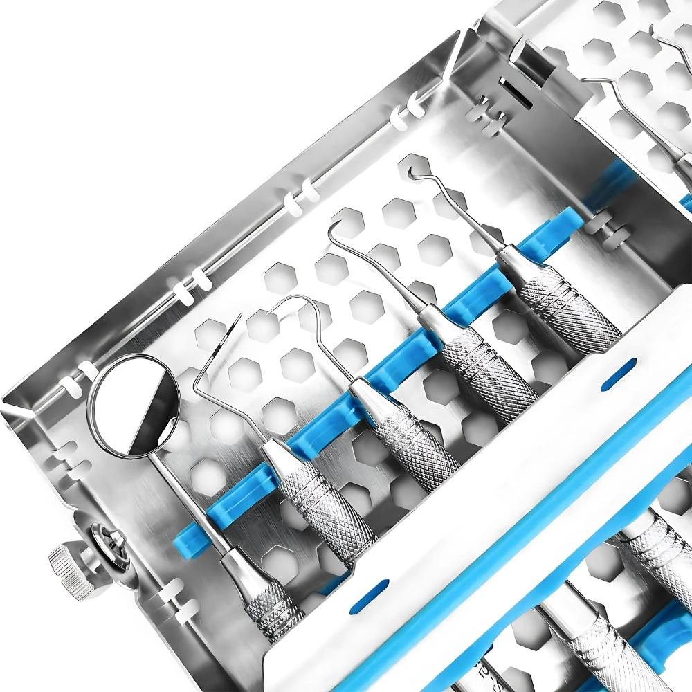 Includes double decker sterilizing cassette, #5 mouth mirror and handle, Gracey Curette 1/2, 7/8, 11/12, 13/14, scalers McCall 13/14, 204S, and H6H7, probe CP12, and explorer #5